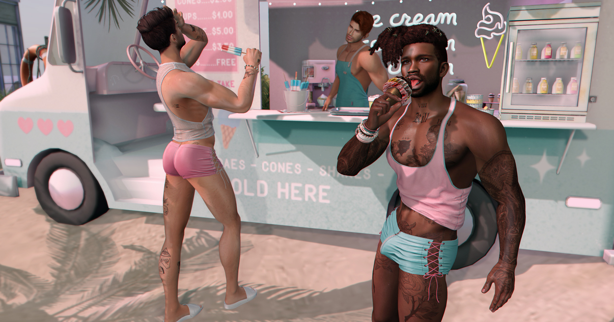 Noche’s new Blaze Shorts have been launched at the current round of Equal 10 (ending October 5th) and are a perfect example of a pair of very wel executed very short shorts. I particularly like the string detail on the sides and the rather provocative two-way zipper that runs all the way from the front to the back. The lovely thing here is that even a single texture version lets you use a contrasting colour for the strings to tie in nicely with your outfit. These sexy shorts are bound to inspire me to visit tropical sims this winter and escape of my cold, wet, slippery, slushy reality for a bit. There the perfect beach wear items without necessarily being swimwear. Now I’m going to follow into the footsteps of my avi, get myself an ic cream and leave you with the credits.