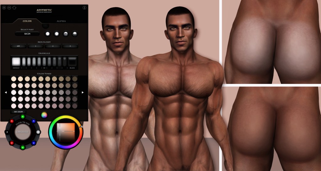 There are hardly any skin options for the Aesthetic body, but you can tint the basic skin to better match your mesh head. Play around a little with the color tones or pick a colour with the wheel and square on the right and apply it to the skin with the Use now button on the left. The colour will be applied to your body and headblender.
