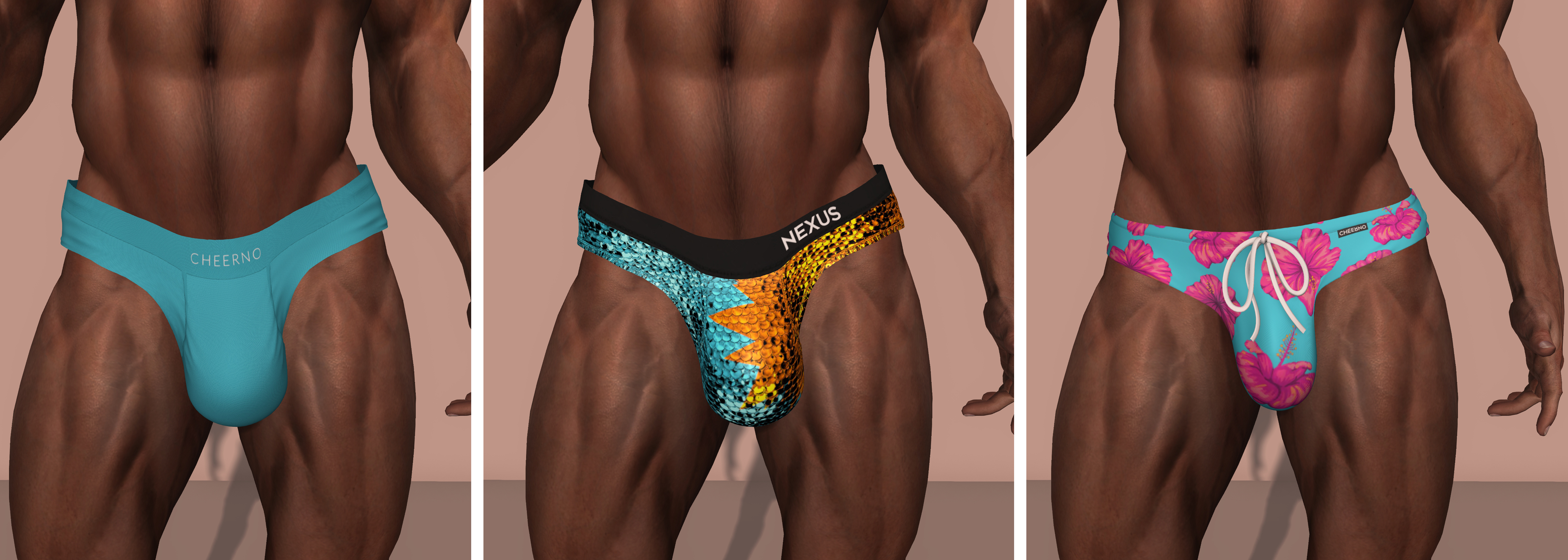My little collection of Cheerno briefs and swimwear. Each comes as a kind of mini fatpack with 6 texture options. From left to right, these are the SMR21 briefs, F21 sequinbriefs and S22 speedo.