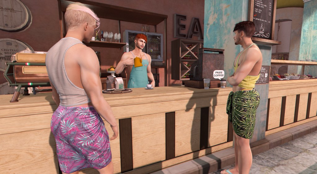 Personally I like to put together a couple of beachy outfits that compliment each other, making good use of how easily one switches from one outfit to another with the push of a button. In this case I made one outfit with swimwear (the newest thong by Noche) and made a second one that is slightly more covered up and more appropriate for a visit to one of the several cafes you’ll find at Butter Beach. I’m not sure if David Beckham really succeeded in making the sarong a thing that plenty of men actually wear. I think it was just a short-lived fad, to be honest. I still love my sarong in Second Life™ as an easy transition garment from beach to street, as long as it’s worn in a casual holiday setting. Combine it with a cute tank top and a pair of flip flops or sandals and you’re good to go.