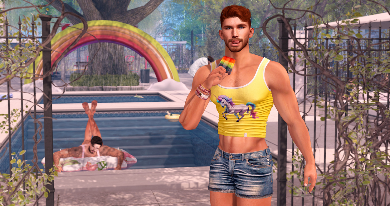 Second Life is my Methadone. Don’t worry, I’ve never done drugs. Sure, I was on morphine for some weeks for the pain in my shoulder, but I haven’t even bothered to pick up the second subscription. I have gone through some pretty crippling periods of online gambling though. To help me combat that particular demon, I have found Second Life to be a helpful distraction from time to time, though it hasn’t always been effective. Distractions have their use, but I should do some more digging around in my psyche to better understand the cause and not just fight the symptom. I’ve been doing well for a while now and I have stayed off the gambling sites for over eight months, but I don’t really know how. It feels weird that I was able to just switch it off. There are very slight twinges when I see or hear an advert for a gambling site, but mostly I’m enjoying the relative peacefulness of NOT gambling. Not only does Second Life give me something else to do, it also offers an easy outlet for creativity without sapping too much of my energy. Take something as nice and simple of Noche’s latest “Toni” tanktop for example. You can upload your own images and apply them to the tank top. I’ve always liked a bit of customisation. Give me this in June and of course I’m going to put a gay unicorn on it. Deuh! It’s one of those tiny little things I can hold on to as and when they give me a few fleeting moments of happiness… But I probably should get therapy. Then again, it’s not that I really feel miserable all the time. Things just kinda feel a bit off, most of the time. I don’t know if that’s normal or just my normal.