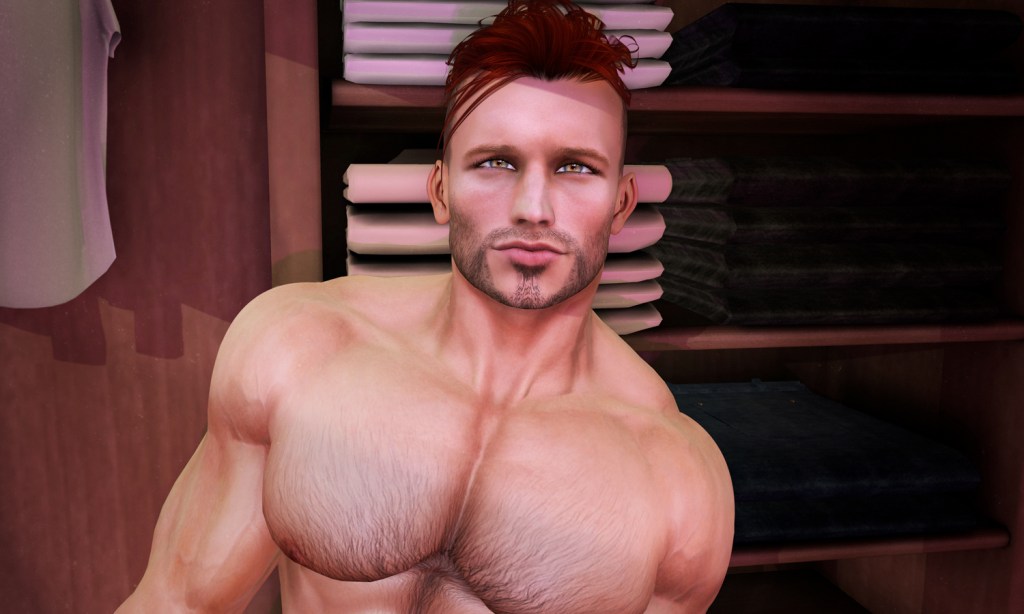 It’s safe to say that in certain areas of Second Life™ spotting a Niramyth Aesthetic mesh body is a very rare thing indeed. Head over the adult world and gay-men-only sims in particular and you’ll find that in some cul-de-sacs this mesh body still has a loyal fan base. Maybe it’s because these fans don’t like change, or it could be that they haven’t found anything that matches the distinctive Aesthetic look. Personally I only dust it off every now and again, when I’m feeling whimsical, which is peculiar as there is nothing all that whimsical about this muscle man.