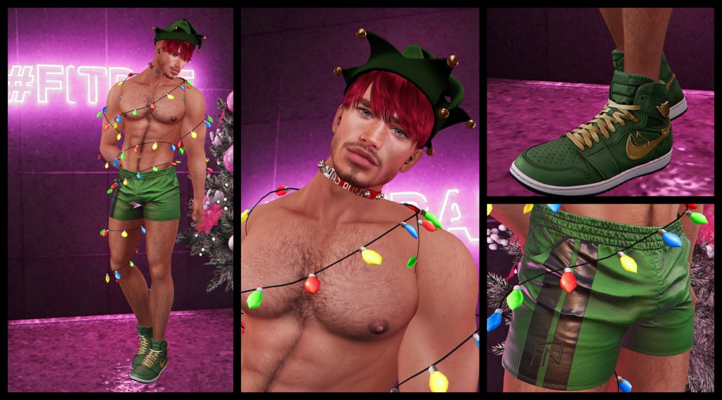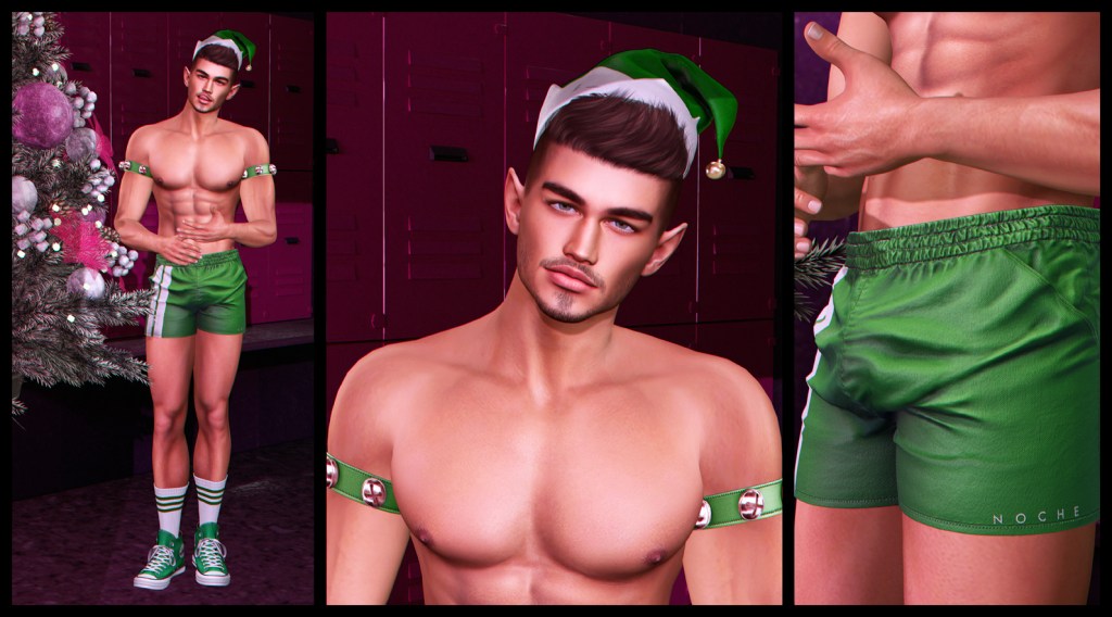 In Second Life™, pointy-eared sex on legs is a phenomenon, especially at gay sims. As soon as I saw Noche had released a new pair of shorts, I new I had to go with a sporty elves theme. Obviously elves have to go to the gym to keep fit and work off all those gingerbread men, candy canes and mulled wine. OK, in SL they don’t really have to, as the calories don’t count in here, so maybe they just enjoy hanging out together, like a bunch of manly bros? Yeah sure, that must be it. There’s nothing homoerotic about it at all.