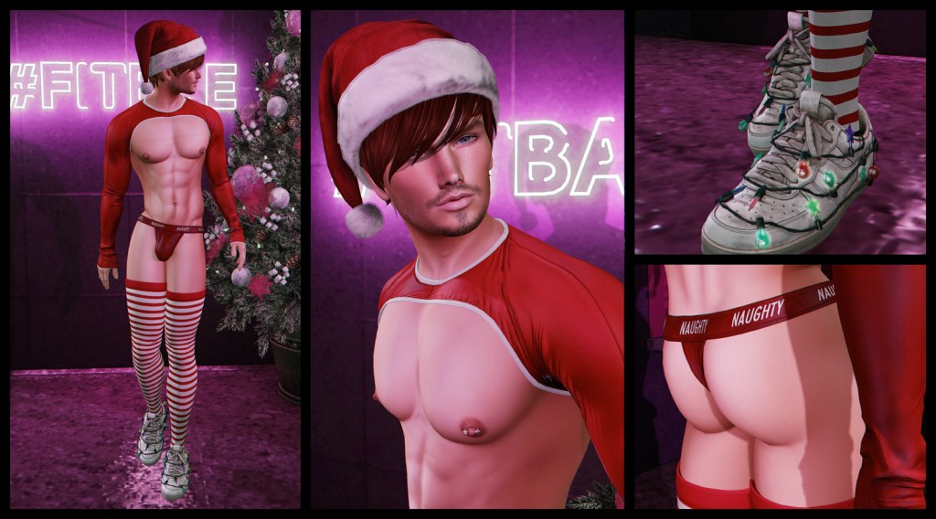 For those of you who aren’t quite ready yet to let go of the Christmas magic, there’s a wealth of Christmas costumery of the sexy variety for boys at Noche and Tylie. My somewhat late Christmas gift to you is the painstakingly gathered list of credits for the four looks below.