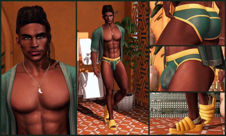 Basically this is another one of those “just and outfit” posts, with some random wittering on. These occasions are perfect for showing off an at-home look and if you’re going to be lazy, you might as well do it in style with Noche. Earlier this month they released the cute (ridiculously) short Ian Robe and a little while ago the Franco Brief came out to brighten my day. I’m not sure I’ve ever called it a fetish before, but this underwear “thing” I have in Second Life™ is pretty strong and luckily there has been a constant stream of new items hitting the market over the years, with the quality of the pieces steadily improving. The PBR textures sure have added to the enjoyment, although I’m still struggling with finding the right light and possibly I’m due a laptop update, as my aging Asus ROG beast is starting to huff and puff its way through SL. I can relate. It takes a conscious effort to suppress the old man noises every time I get up from my office chair with this nearly half a century old thing I call my body.