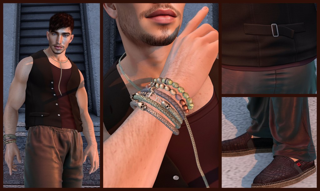 I was hoping to find a big fluffy cardigan for a cozy lazy Sunday look, but halas, I had no such luck. In the end I settled for a vest and tanktop combo by Guilty. I played with the idea of getting myself the fatpack, but in all honesty, I feel I’m not spending quite enough time in SL these days to justify the “investment”. I went for a single colour version in brown, sticking with the autumn colours of the previous blog post. It comes with a simple chain, which is a nice extra touch for this outfit and it made me dive into my inventory to grab some bracelets to complete the look. And with that, it’s a wrap! Oh, a nice woolly wrap would be great with those silk pants too!